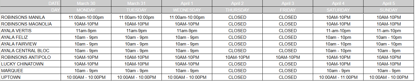 Holy Week 2026 (March 30 to April 5, 2026) Store hours